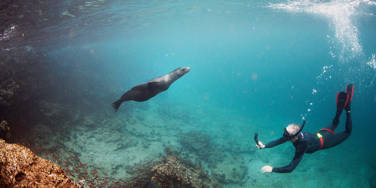 En faisant de la plongée libre avec mon groupe dans l’eau claire de l’océan Pacifique, j’ai aperçu des labres arc-en-ciel, des balistes et des poissons chirurgiens à la queue jaune vif. Mais ce qui m’a le plus enchantée, ce sont les otaries qui ont décidé de se joindre à notre groupe de nageurs. Lorsque nous sommes sortis sur le sable, ils ont fait de même, s’allongeant à côté de nous comme une bande d’adolescents qui profitent des rayons du soleil.